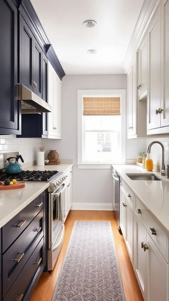 A black and white color scheme provides drama and sophistication in a galley kitchen. Try black lower cabinets with white uppers, or vice versa. Add a white subway tile backsplash and black hardware for a harmonious effect.